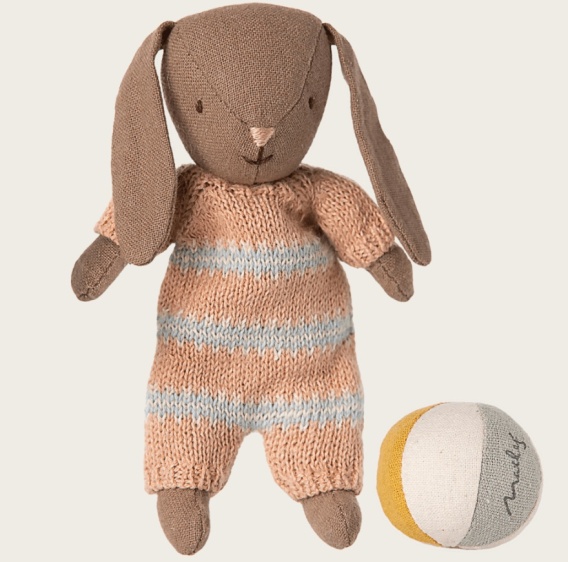 Brązowy Króliczek Micro Maileg w Pajacyku Jasny Róż z Piłką to maleńki, uroczy króliczek w pastelowym pajacyku, zapakowany w dekoracyjne pudełeczko idealne na prezent. W zestawie znajduje się także miękka piłeczka.