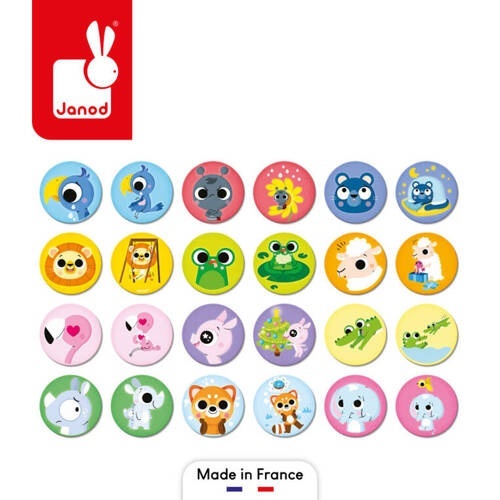 Gra memory Emocje francuskiej marki JANOD to wspaniała zabawa dla jednego lub kilkorga dzieci. Składa się 24 (12 par) solidnych kartonowych okrągłych żetonów w różnych kolorach, z postaciami zwierzątek. Zwierzęta należy skompletować – parę tworzy cała postać oraz jej buzia, wyrażająca emocje, m.in. smutek, zakochanie, zachwyt czy zawstydzenie. Gracz, który zgromadzi więcej par – wygrywa. Gra typu memory trenuje pamięć, koncentrację, spostrzegawczość i refleks. Zabawka została zaprojektowana i wyprodukowana we Francji. Zapakowana jest w estetyczne kartonowe pudełko. Idealnie nadaje się na prezent.