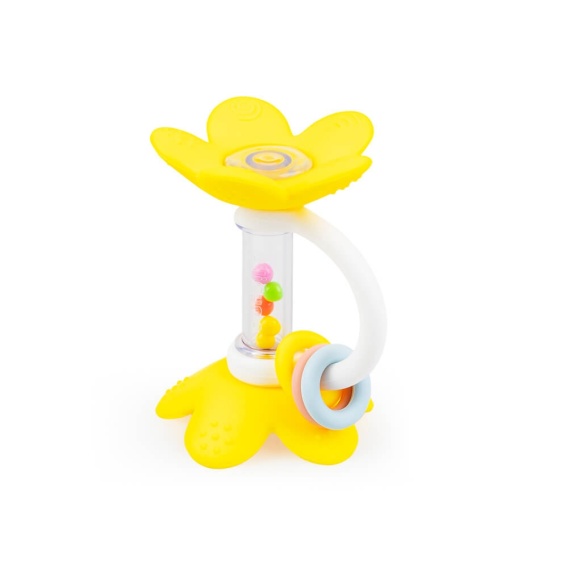 Grzechotka w kształcie kwiatka, przeznaczona dla niemowląt. Lekka, poręczna i łatwa do chwytania przez małe rączki, odpowiednia do codziennej zabawy.