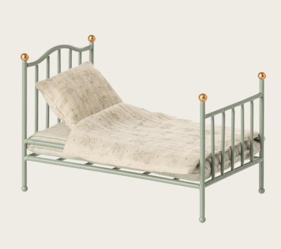 Metalowe łóżko do Myszek Maileg pojedyncze - Mint to uroczy mebelek w pastelowym odcieniu mięty, który wprowadza do świata Maileg lekkość i spokój. Idealne do mini sypialni, pokoiku dziecięcego lub jako element rodzinnych scenek myszek Maileg.