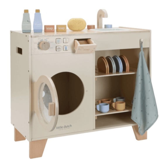 Drewniana pralka Little Dutch z edycji limitowanej. Realistyczne pokrętła, otwierane drzwiczki i dodatki do zabawy w dom. Bezpieczne drewno FSC.