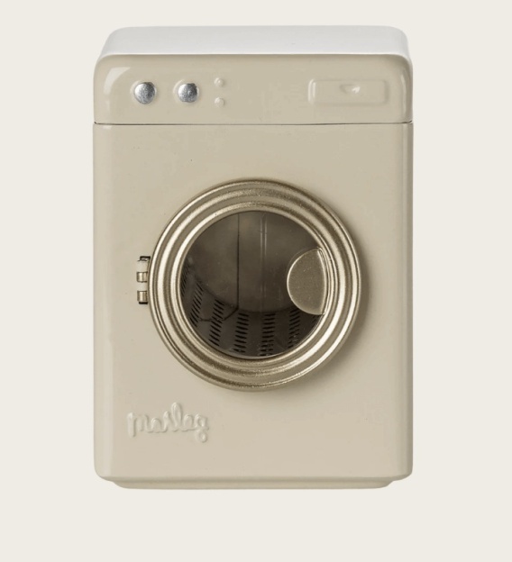 Pralka wykonana jest z metalu i utrzymana w klasycznym, delikatnym odcieniu ofbieli. Drzwiczki otwierają się, co dodaje realizmu i zachęca do zabawy. Idealnie pasuje do łazienki w domku Maileg.