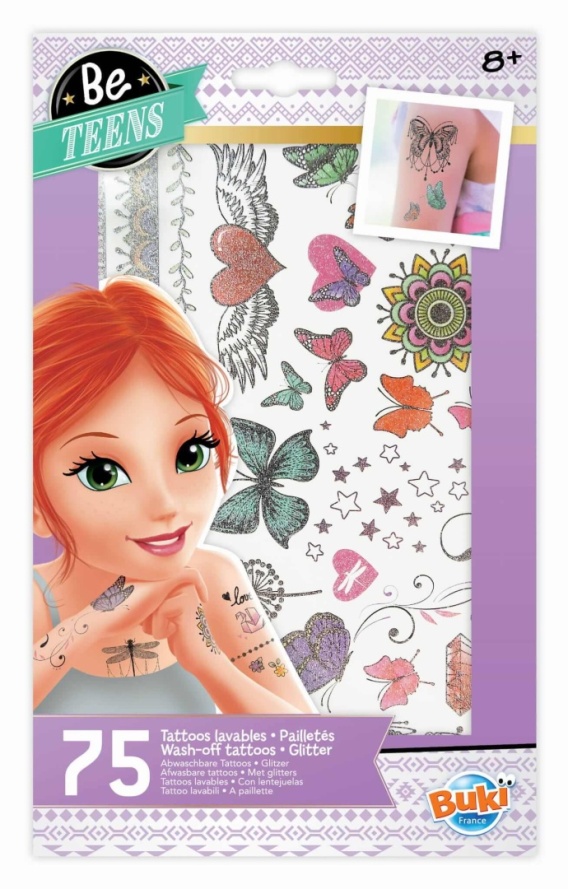 Zestaw zawiera 2 arkusze z około 75 zmywalnymi, brokatowymi tatuażami z motywami roślin, serc czy motyli. Tatuaże brokatowe Buki to świetny wybór na prezent lub urozmaicenie codziennej zabawy. Znajdź wersję, która najlepiej pasuje do Twojego dziecka i zobacz inne kreatywne propozycje w Manustore.