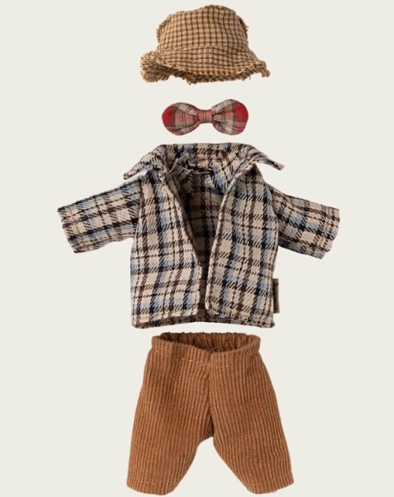 Ubranie dla Myszki Maileg Dziadek to propozycja dla dzieci, które lubią uzupełniać swoje myszkowe kolekcje o nowe elementy. Zestaw zawiera charakterystyczną czapkę, stylową marynarkę w kratę oraz brązowe spodnie – ubrania uszyte z dbałością o detale, z materiałów przyjemnych w dotyku i łatwych do zakładania.